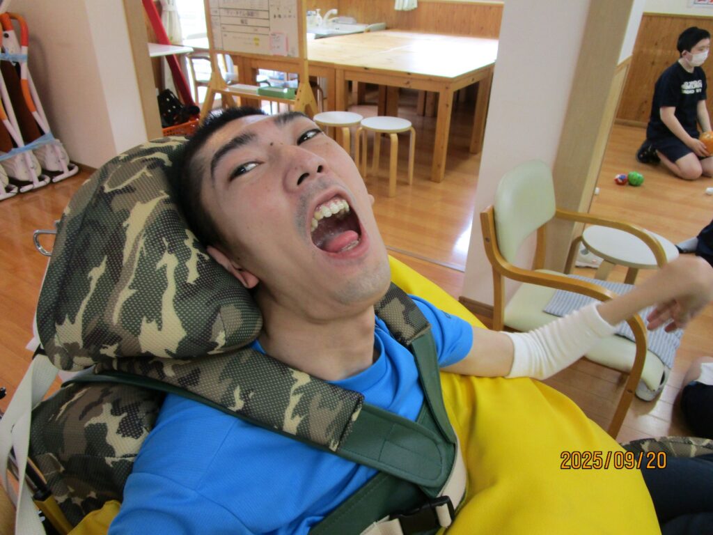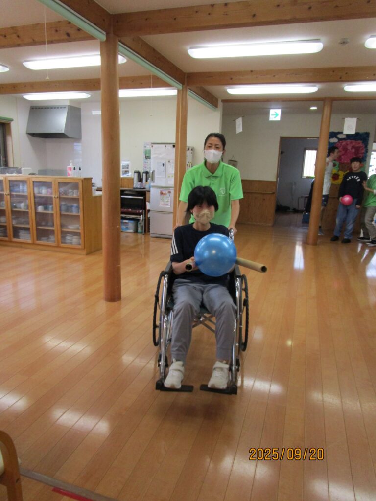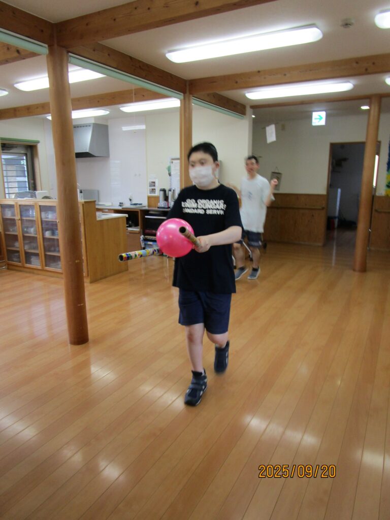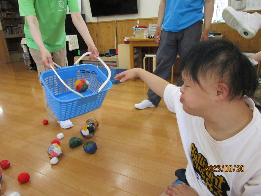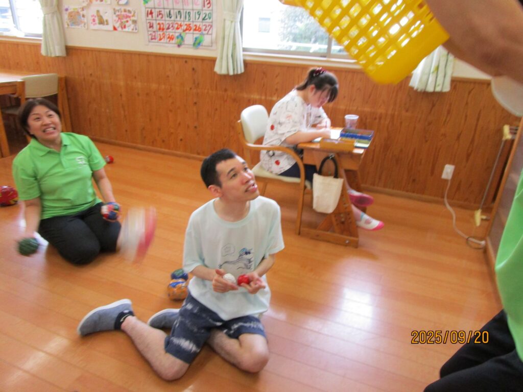 『スポーツの秋』 2025 9/22 ぷらたなす 運動会気分で“玉入れ”と“ボール運び”で競争をしました。 皆さんのボールを投げ入れる技術はなかなかのもので、AチームもBチームもいい勝負でした。 ボール運びは棒にボールを挟んで歩き、柱をグルっと回って帰ってきます。ボールを落とさずに上手に運べました! 良い汗をかいた後は、お買い物で買ってきたおやつを美味しく食べました♪ ぷらたなす