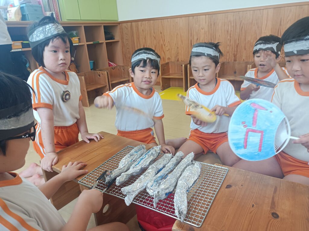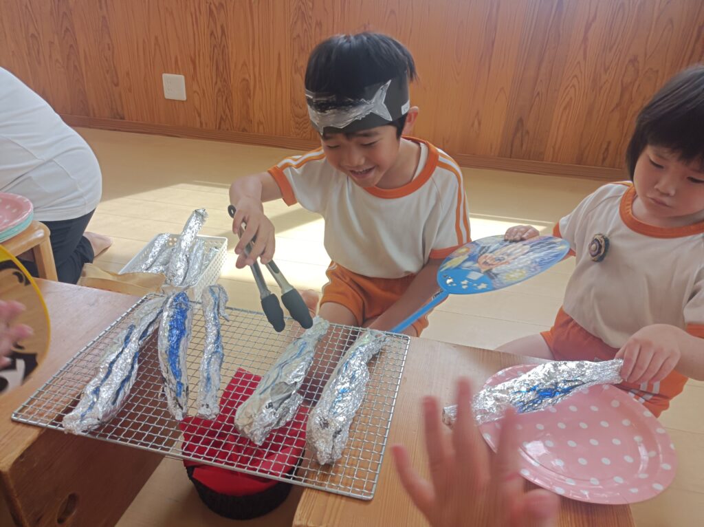 さんま祭りに向けてお面や、アルミホイルでさんまを作り、みんなでさんま焼きごっこをしました。