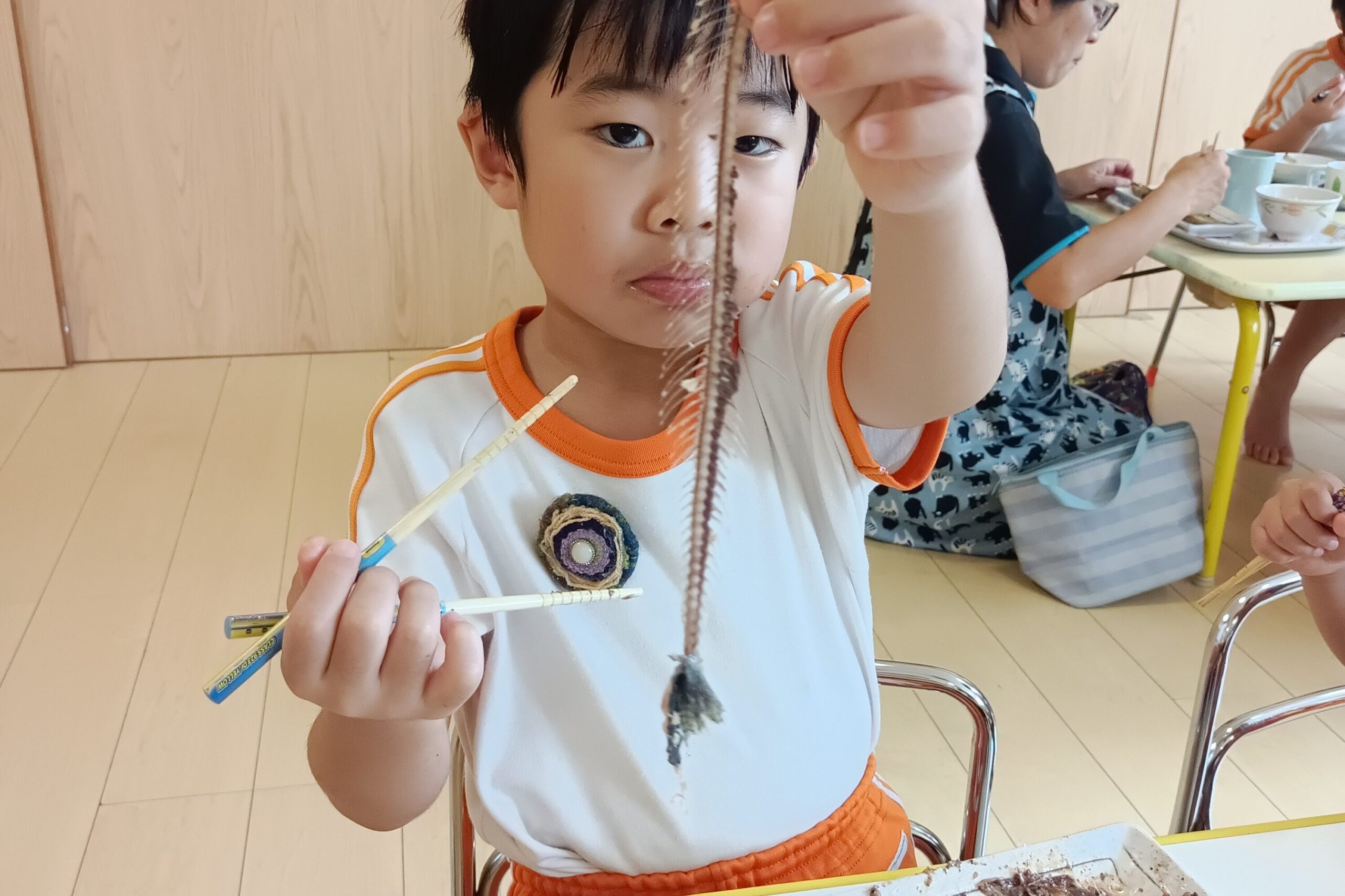 さんまの焼ける匂いを感じたり、こんがり焼けたさんまを見て「早く食べたいね」と待ちきれないようでした。さんまの骨だけになるようにきれいに食べました。あまりのおいしさに「おかわりないの?」と言う声も聞かれました。