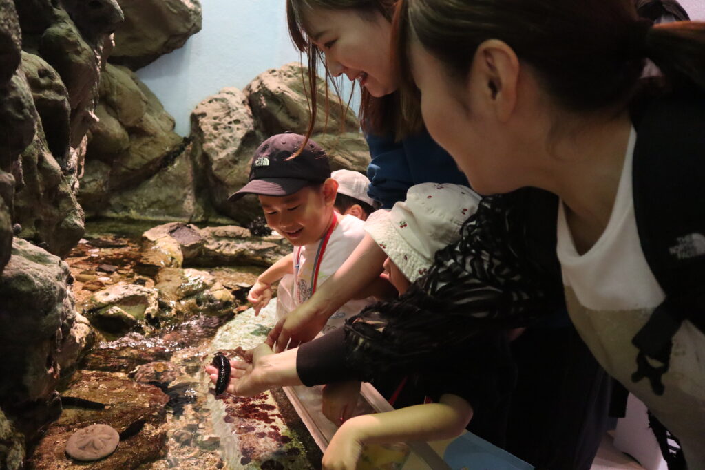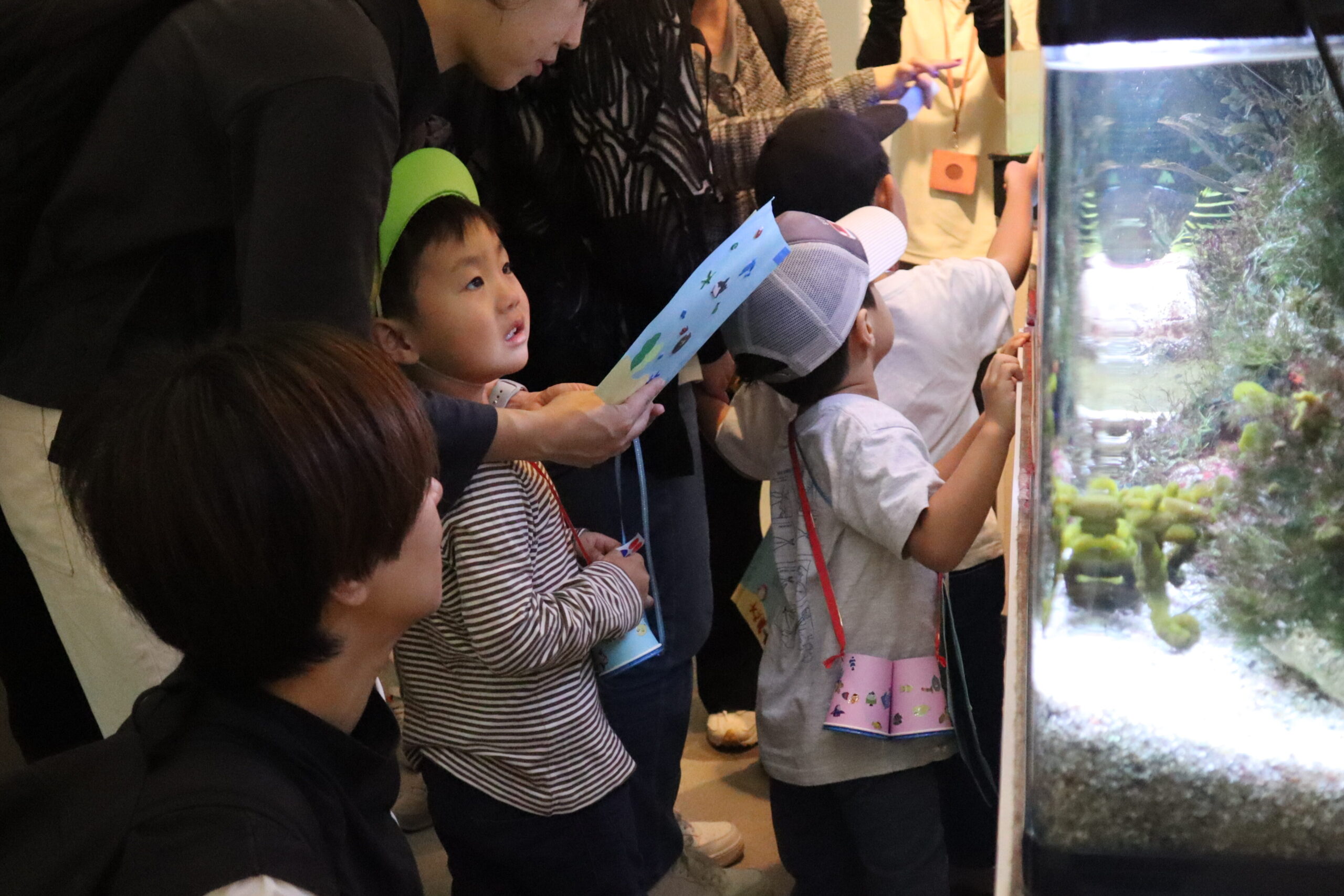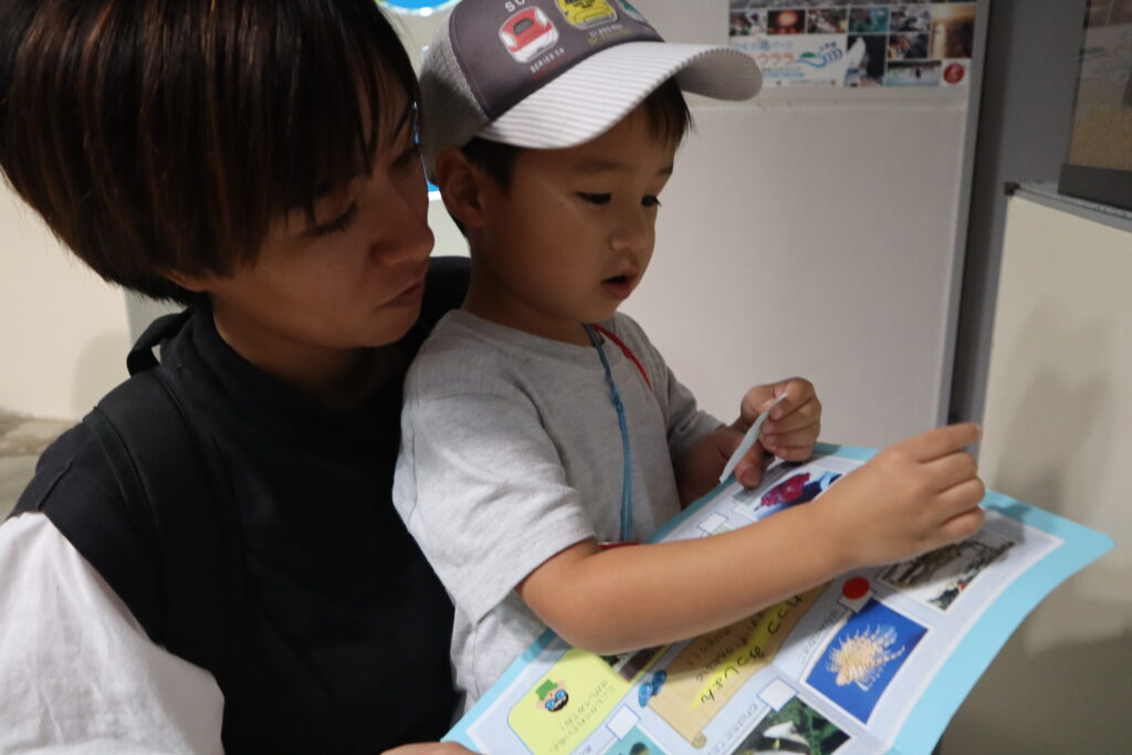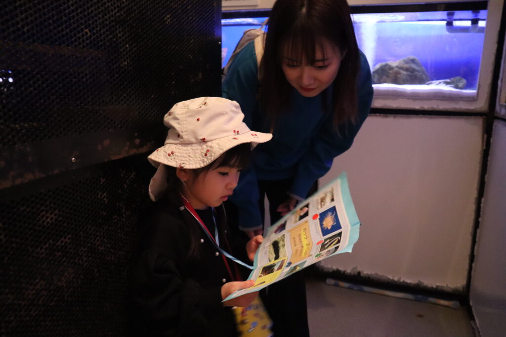 パンフレットに載っている魚と見比べて、「あ!同じのいたー!!」と嬉しそうにシールをペタリ。なかなか見つけるのが難しい魚もいて、魚がどこにいるか親子で一緒に探す時間も楽しい時間となりました。