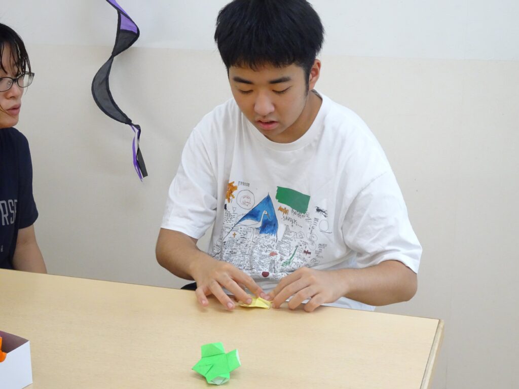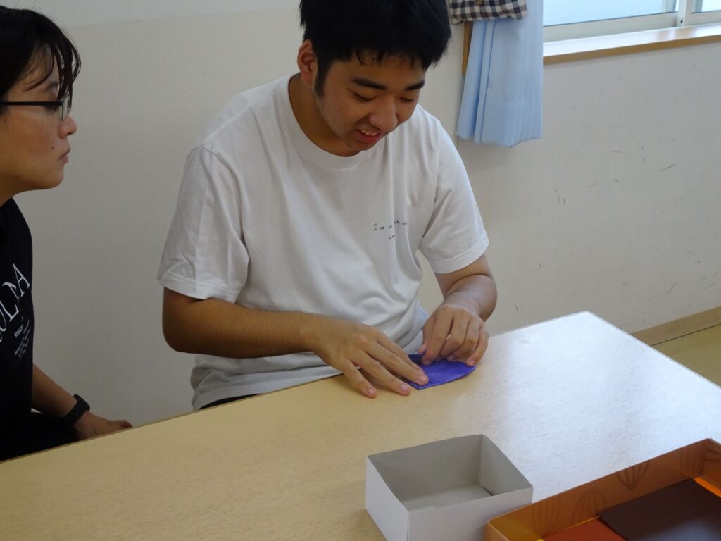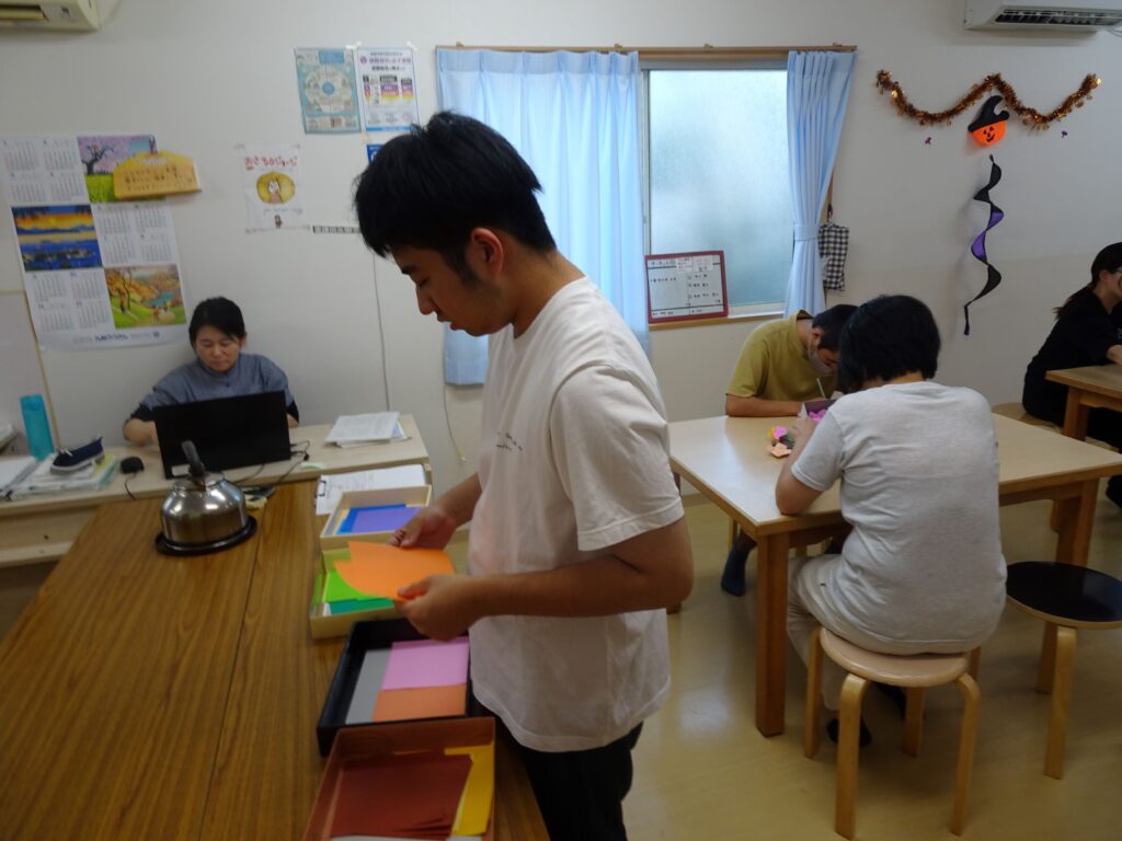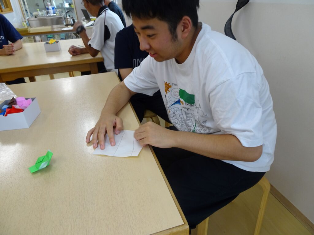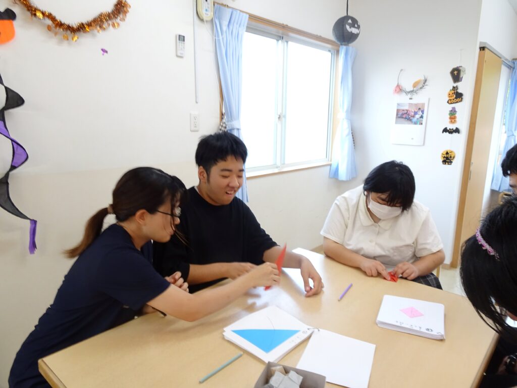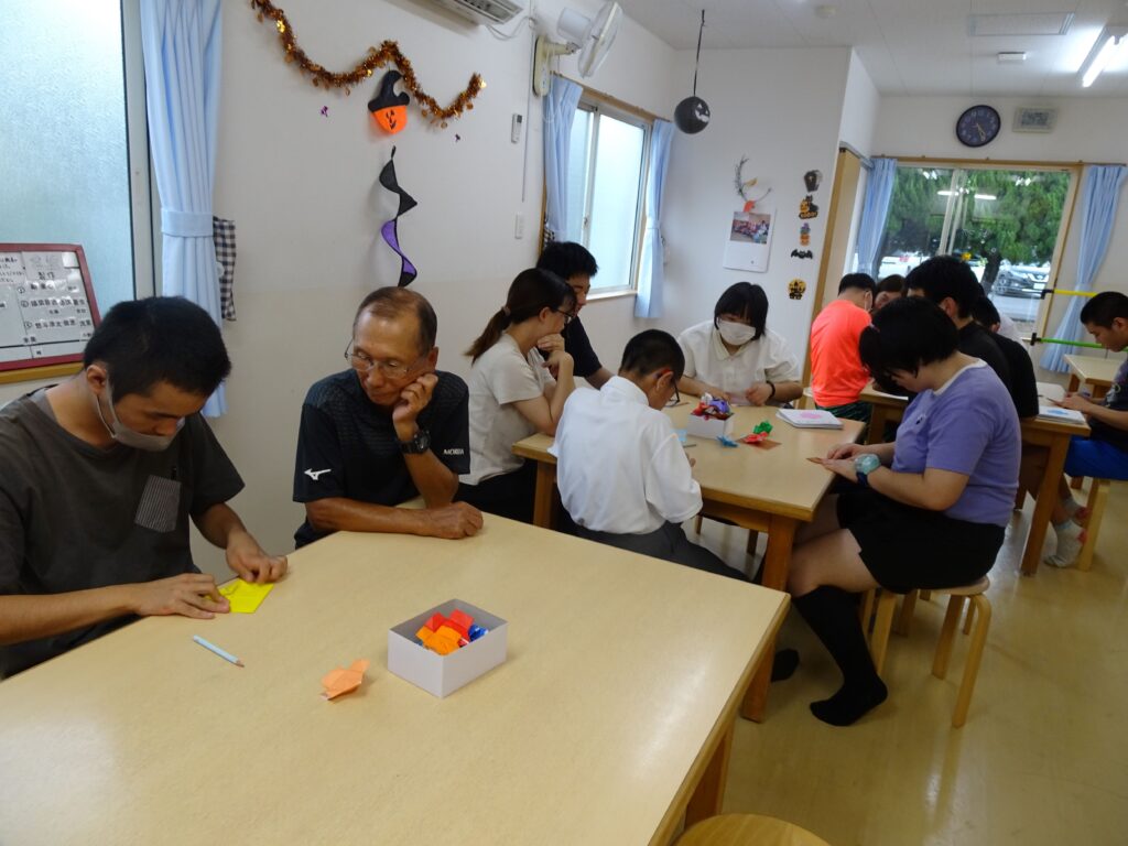 やっこさん折りに夢中 2025 10/21 なかま 今芸術の秋にちなんで、「やっこさん折り」をしています。指先を使って、角を合わせて、ひっくり返してなど意外と難しい・・・。みんな黙々と折り続ける中「やっこさん折り」が楽しくてたまらず、ずっとニコニコして手を動かすメンバーが1人。 なかま