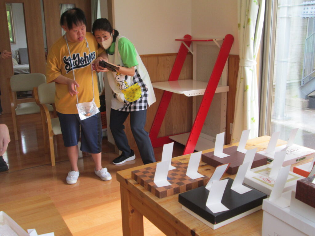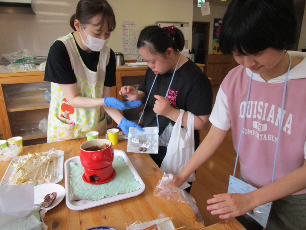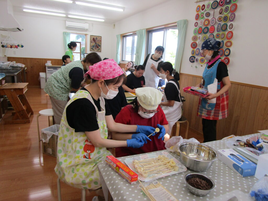 バナナのカット、ウインナーの竹串刺し、お楽しみ箱作り、射的用の的作りなど。