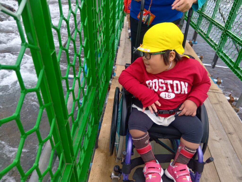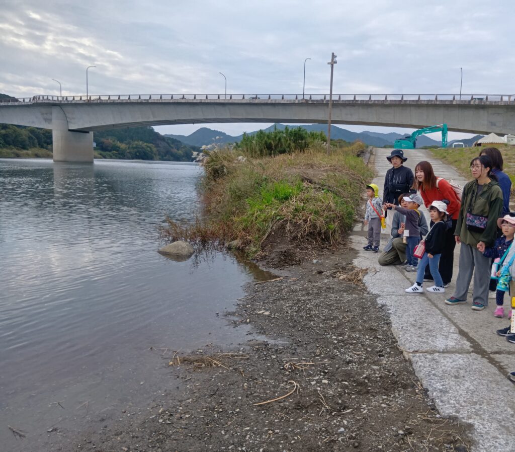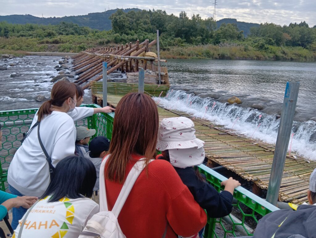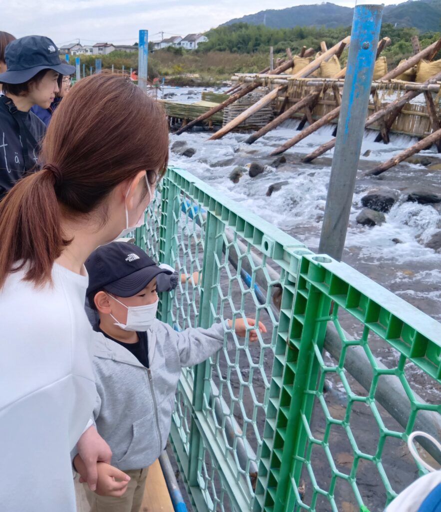 11月10日、ちょうちょグループの子どもたちは、お母さんと一緒に大瀬川にできている鮎やなを見に行きました。