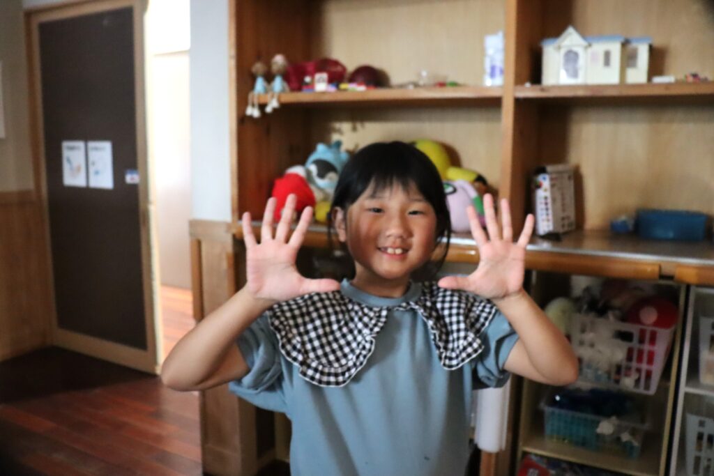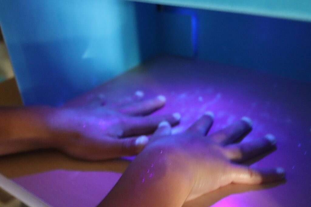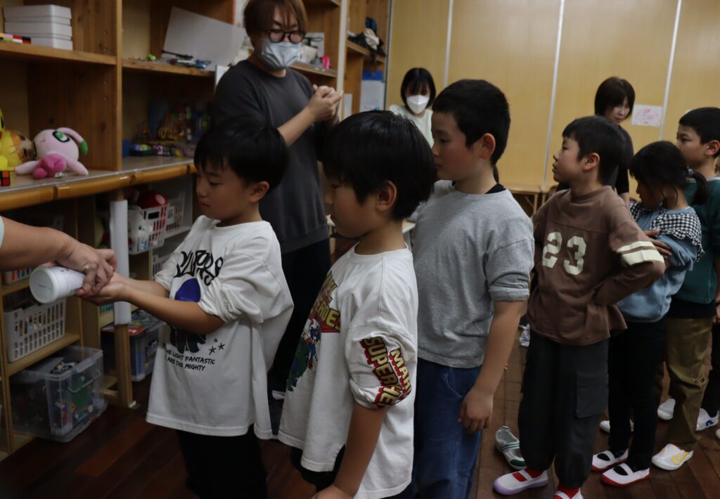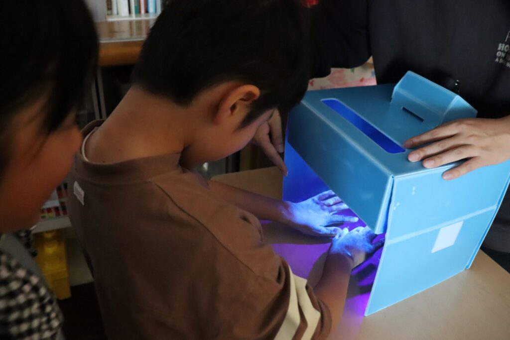 発光ジェルを手に付け、ブラックライトを当てると、白く光ります。石鹸で手洗いをして再度ブラックライトを当てると、洗い残しが白く光るので洗えてない部分が見て分かります。「あれ?ここ洗えてなかった。」と何度も洗ってはチェックを繰り返していました。最後には「やったーきれいに洗えた!」ときれいに洗える方法を見つけ出した子ども達でした。