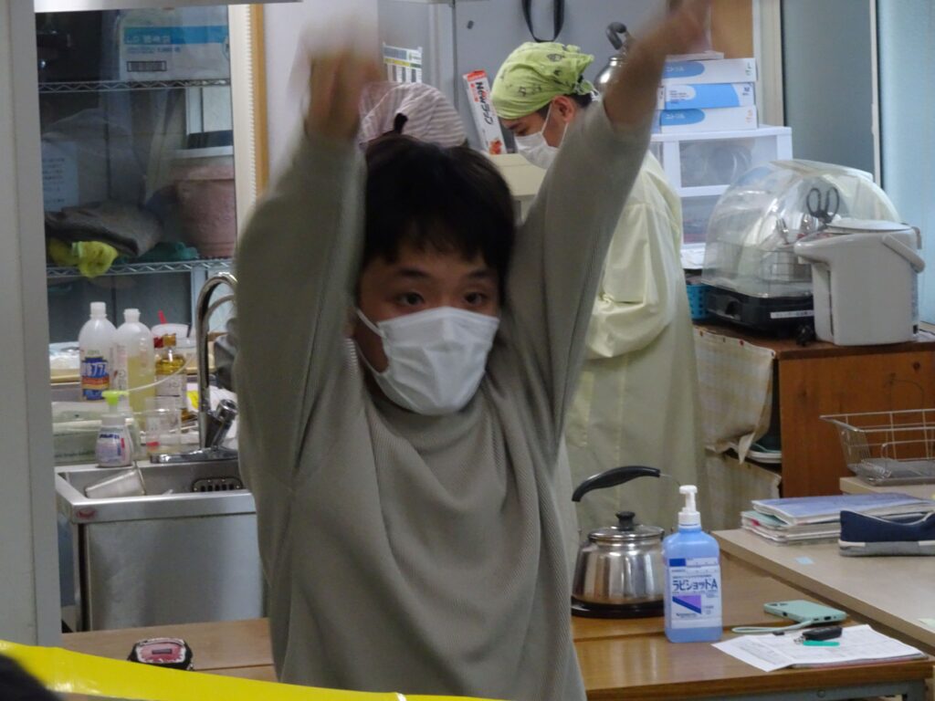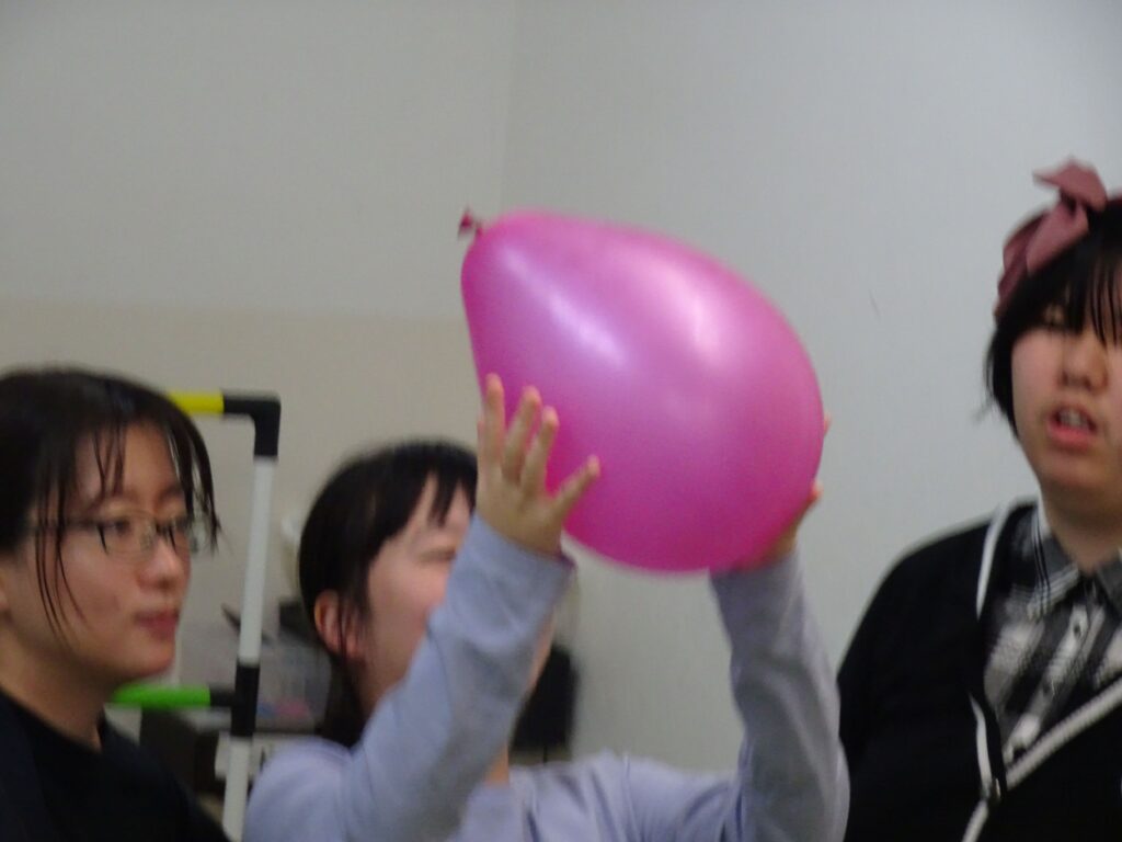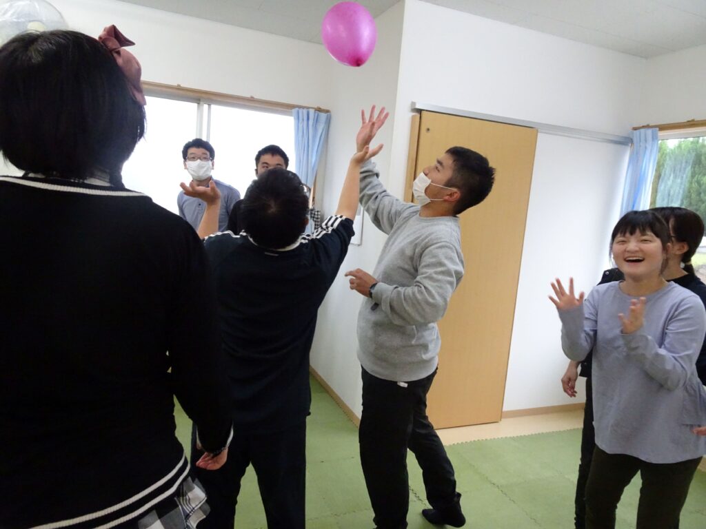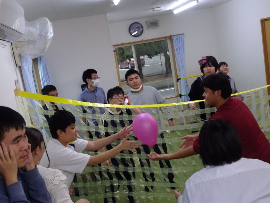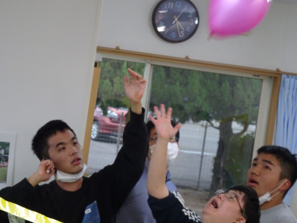 風船バレー 2025 11/14 なかま 久しぶりにみんなで風船バレーをしました。狭いコートの中で、大きな子どもたちがぎゅうぎゅうにつまって、わいわいにぎわいました。必死になると、ついつい自分ばっかり風船を取って投げてしまうけど、職員の声かけで周りのメンバーに回したり譲ったりしてくれます。勝つために、リベロ役をしてくれるメンバーもいて、大変盛り上がりました。 なかま