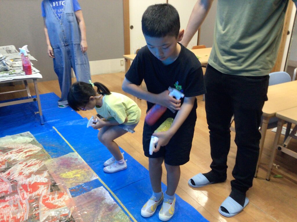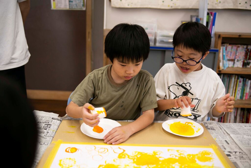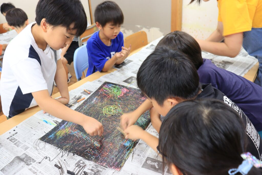 トイレットペーパーの芯を加工してスタンプ!満開の花火に大変身させたり、フィンガーアートで友達と一緒に色の移り変わりを楽しみ、幻想的な夜の風景が完成しました。