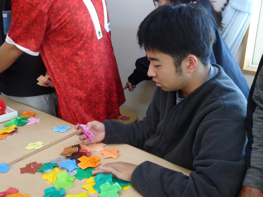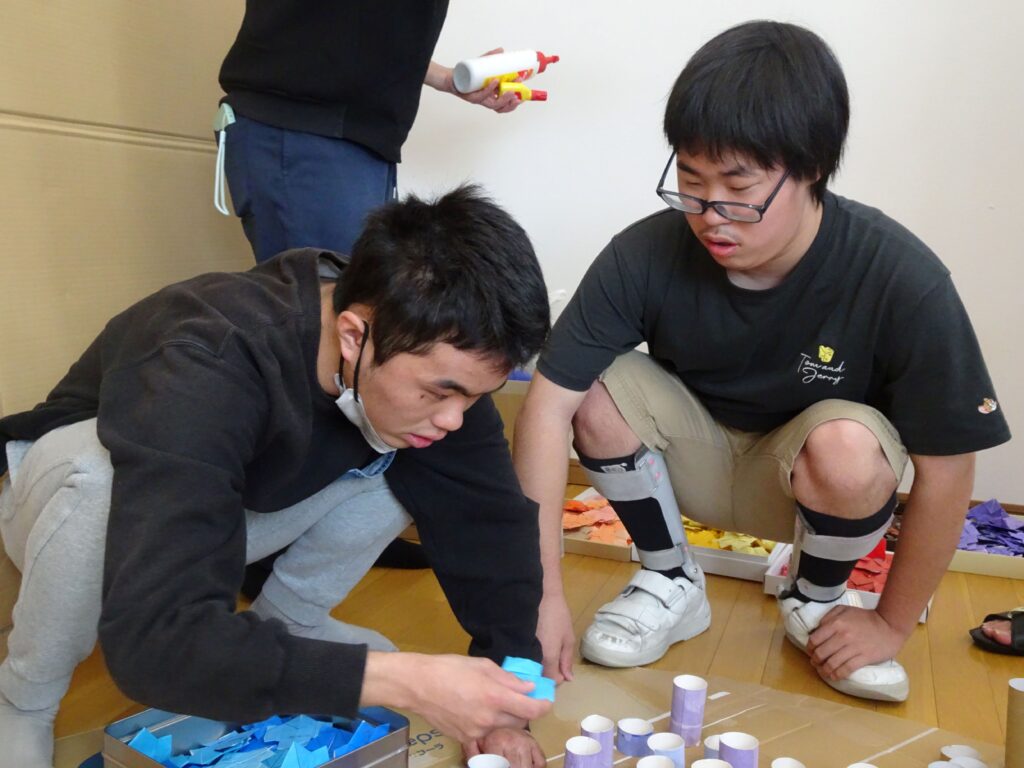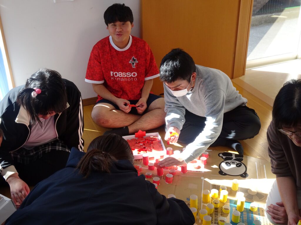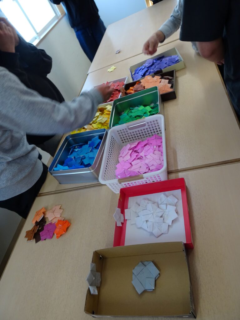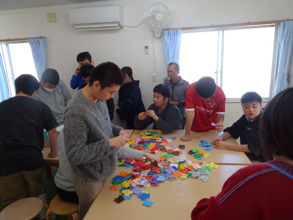 秋の作品づくり 2025 12/04 なかま 芸術の秋にちなんで、秋の作品作りをしました。 今まで地道にみんなで折ってきたやっこさんを色分けと貼り付け作業にとりかかり。作業場所もきゅうくつでかなり地道な作業が続いたのですが、子どもたちの顔は生き生きし、1時間以上がんばって取り組みました。 実は、当日にはやっこさんの数が足りず、完成まで行きませんでした。今でも地道にやっこさん作成中です。 なかま