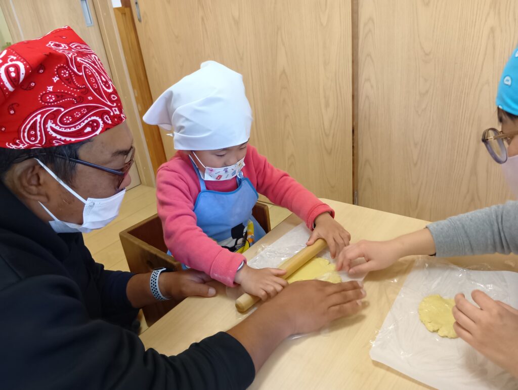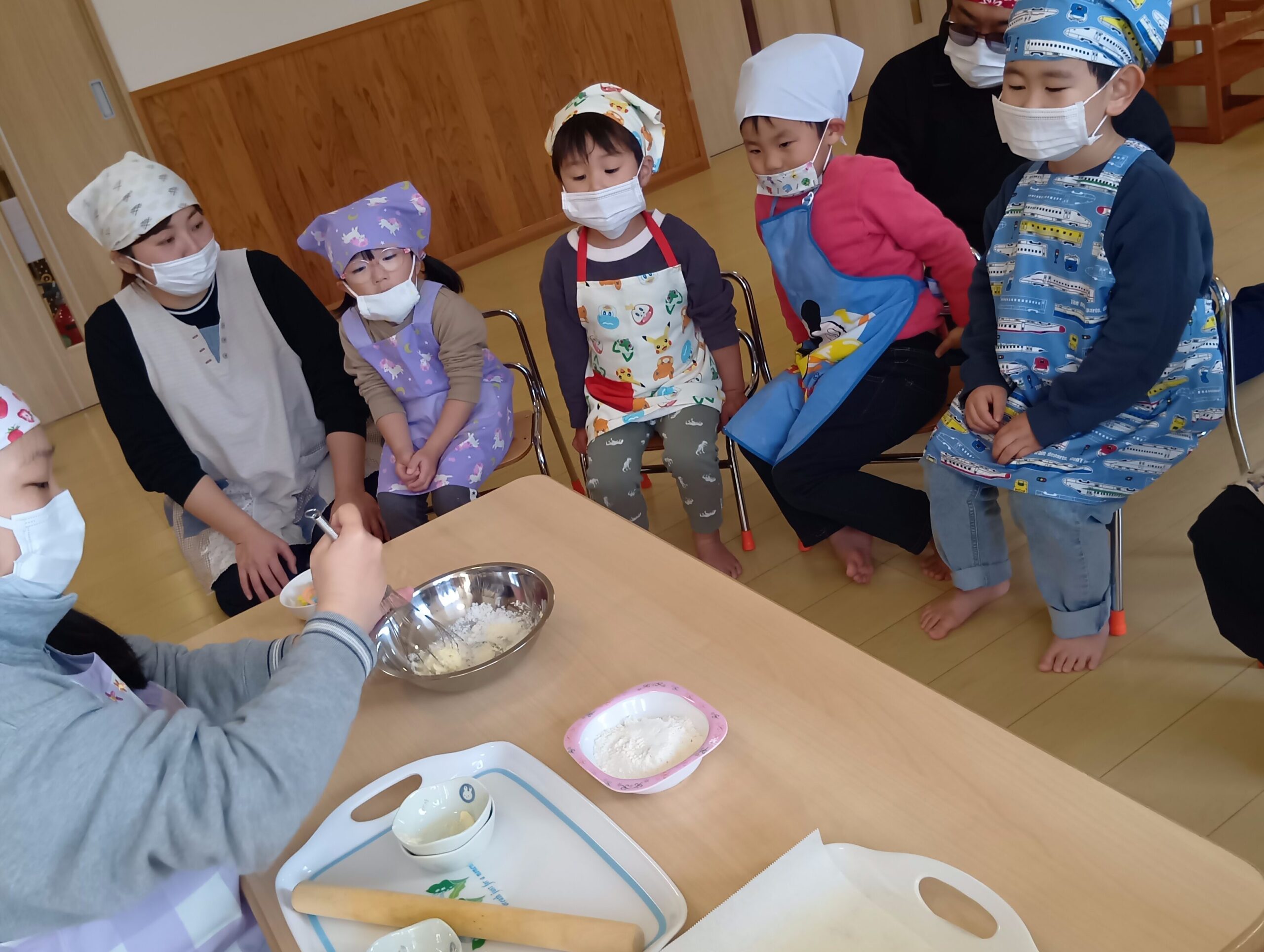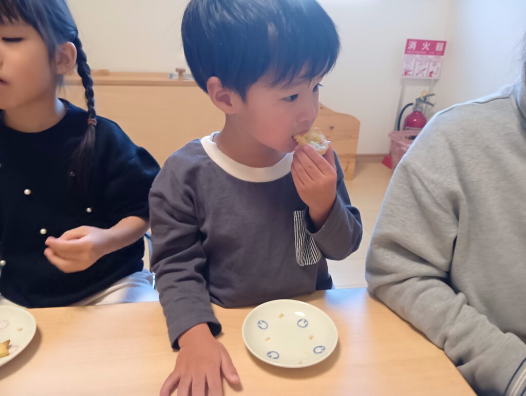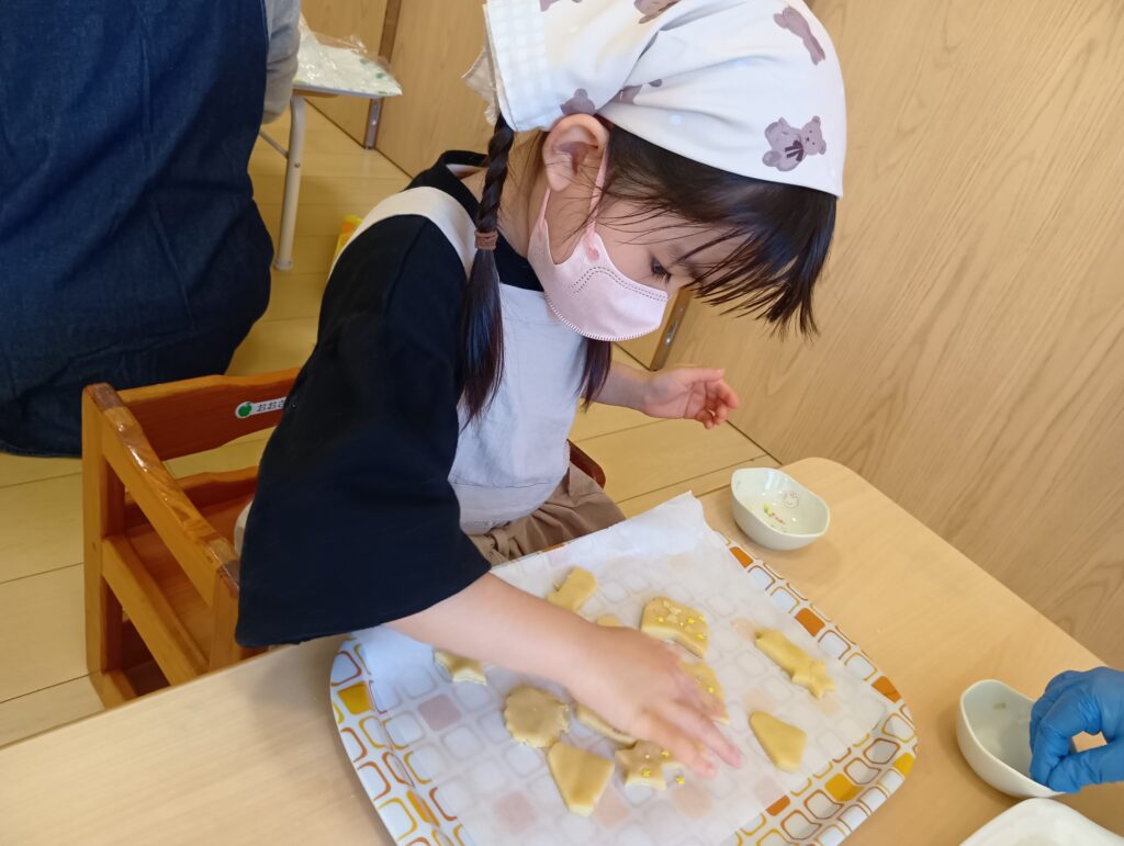 エプロンを身につけ、気分はクッキー屋さん♪色々な形のクッキーを作り、焼きあがる甘い香りに「いい匂い♪はやく食べたい!」「これ、僕が作ったやつだ!」と興味津々。待ちに待ったおやつの時間は、みんなで楽しく美味しく食べることができ大満足の子どもたちでした。