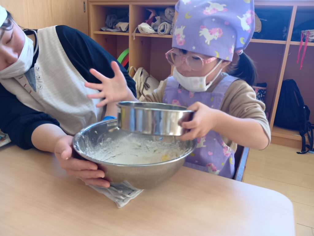 ちょうちょグループの子どもたちが、先生と友だちと一緒にクッキーを作りました。クッキングの当日を迎えるまでに、小麦粉粘土あそびの中で、綿棒を使って生地を伸ばしたり、型抜きをしてお皿に並べてあそんだりと、イメージはバッチリ!前日からクッキングを期待していた子どもたち。