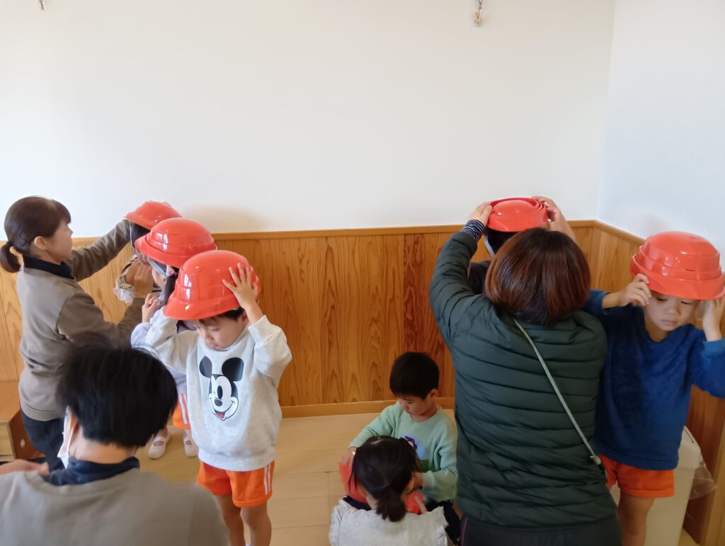 地震の知らせがあると、保育者のもとに集まり揺れが収まるのを待ち、ヘルメットや防災頭巾をかぶり避難靴を履いて外へ避難をはじめました。