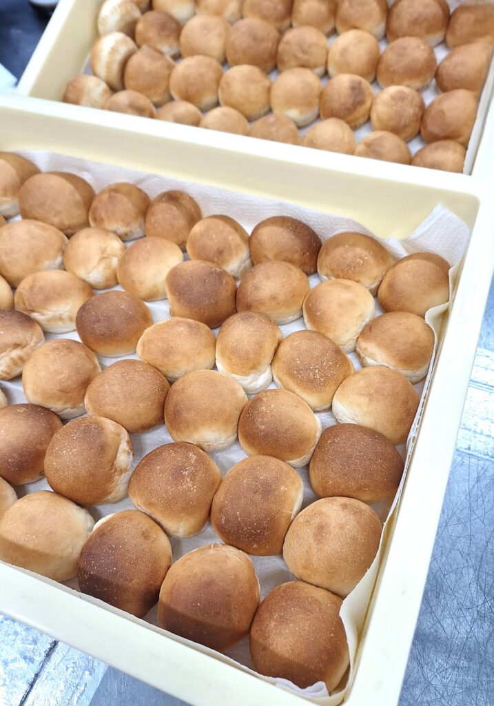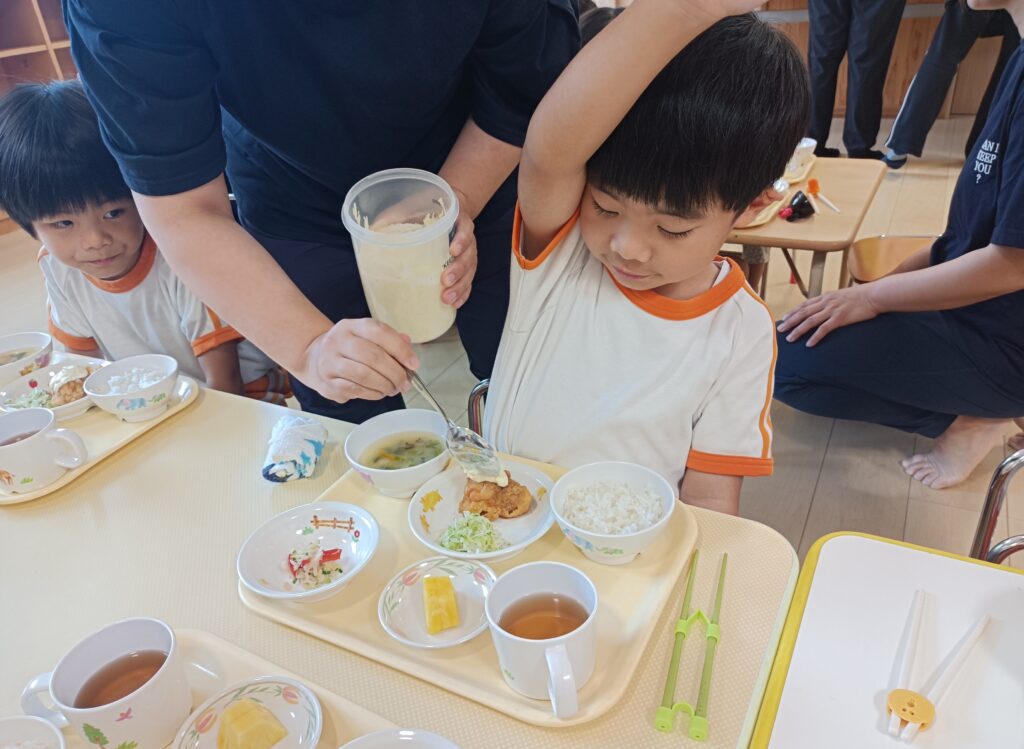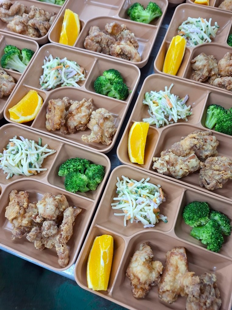 今日は今年最後の給食です。献立は、パン・鶏のから揚げ・ブロッコリー・スパゲッティサラダ・スープ・オレンジです。長期休みのお弁当作りもあり、いつもよりたくさんの野菜やお肉、ぷらたなすパン工房さんの焼き立てパンが届きました!子どもたちに人気の鶏のから揚げはカリッと揚がっています。小学生は冬休み1日目の給食でした。楽しい時間になっていたらうれしいです。今年1年、いろいろな食材を給食やおやつの時間に楽しくおいしく食べてくれた子どもたちの姿に元気をもらいながら給食作りが出来ました!今年も1年ありがとうございました。来年もおいしい給食を届けられるように心をこめて作ります!