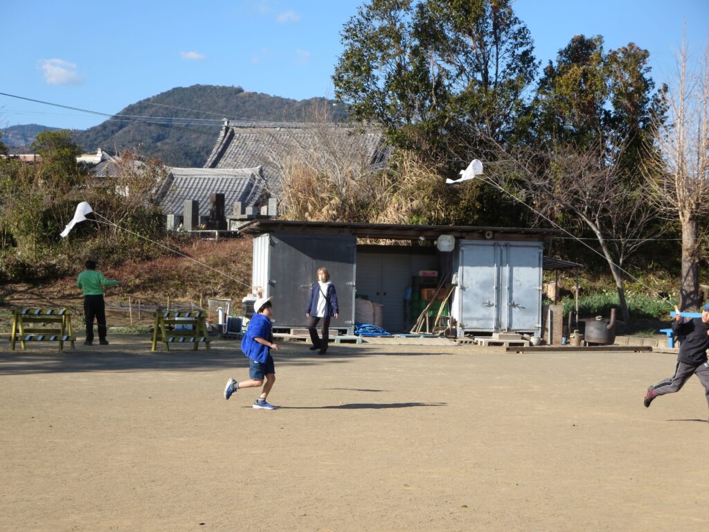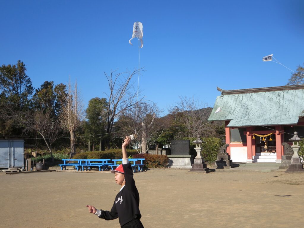 あいにく、ほぼ無風状態の日でしたが、澄み切った青空のもと、微風をとらえてあげる子、走り回ってあげる子、経験が物を言うと言わんばかりに上手にあげ、みんなに感心される子等、さまざまな子ども達の姿が見られながら手作り凧が飛び交いました。これらの凧のように、今年一年、子ども達も更なる高みへ飛躍しますように…♪