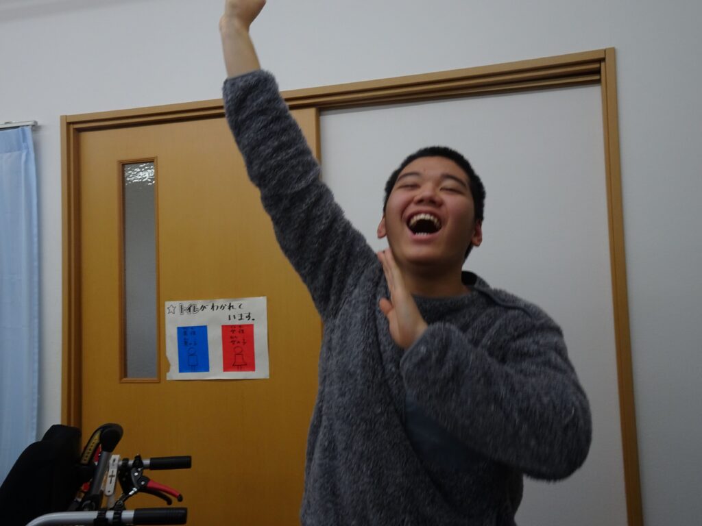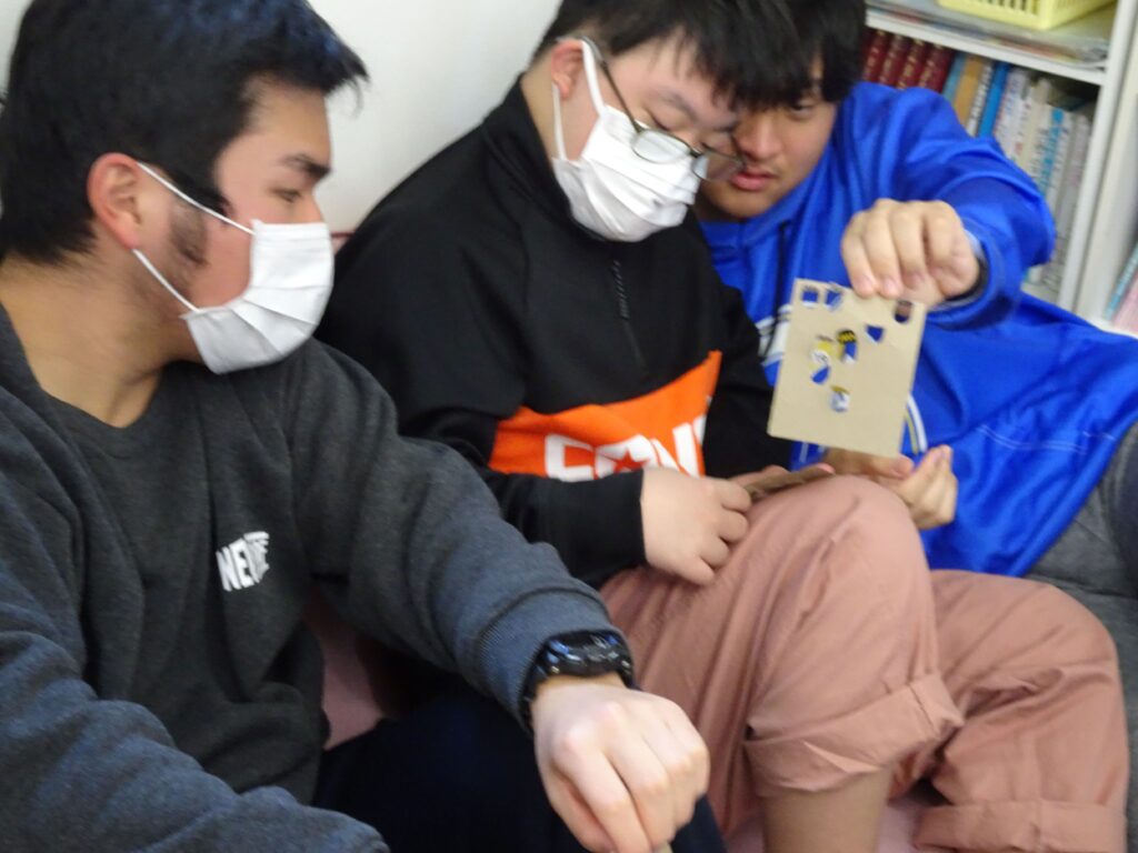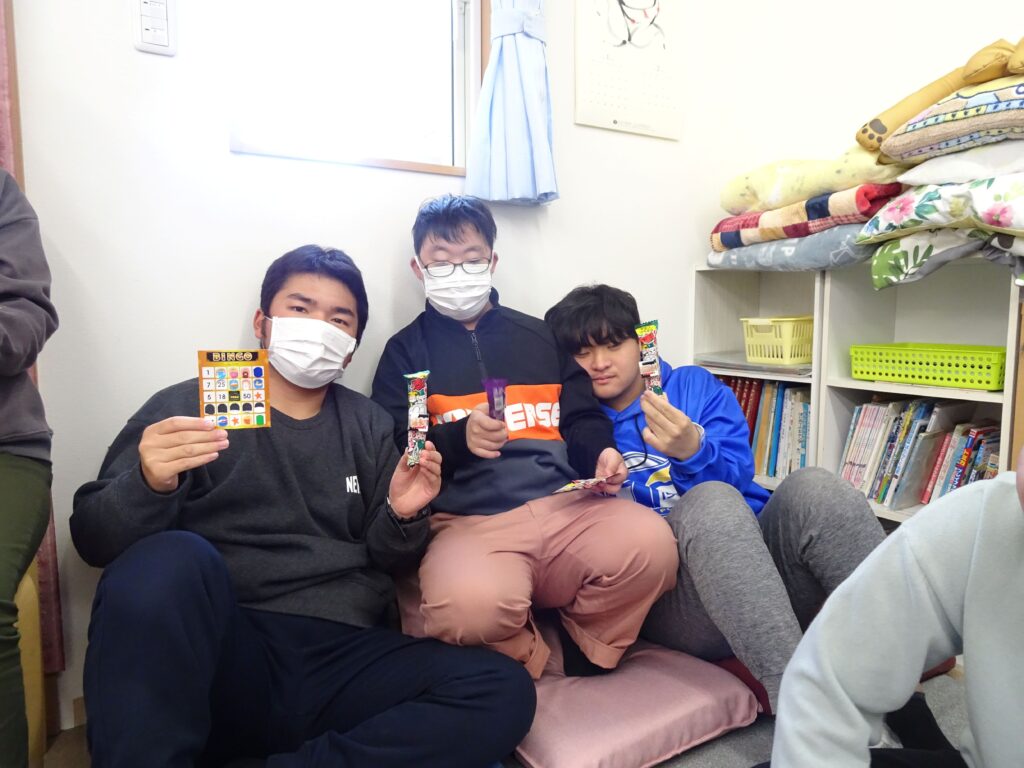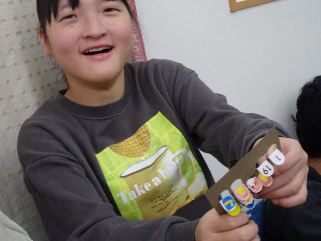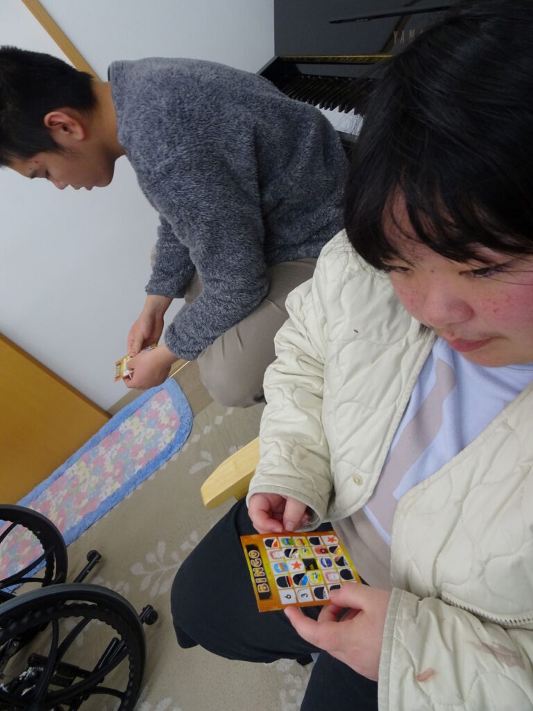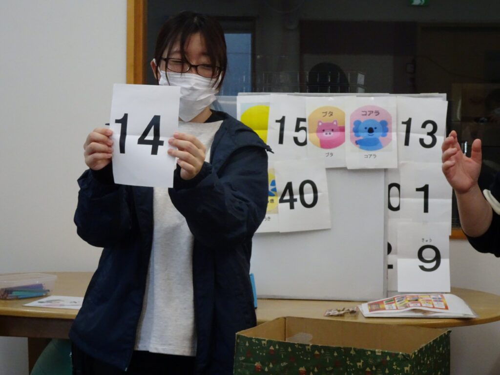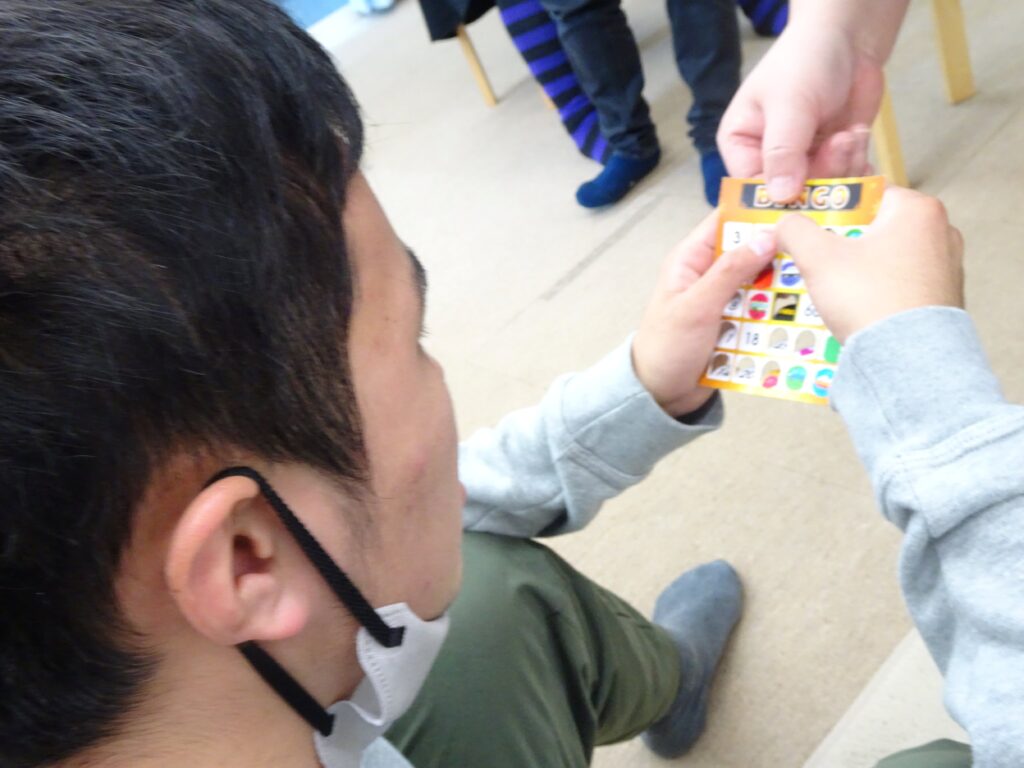 マッチングが得意な子どもたちは、数字やマークが発表されると、手持ちのカードを見つめ、同じ場所を折り曲げることができていました。「ビンゴ!」「リーチ!」の声出しのタイミングが難しかったですが、くり返しの中で、なんとなくわかってくると、大きな声で言えていました。小さな景品をもらってにこにこでした。