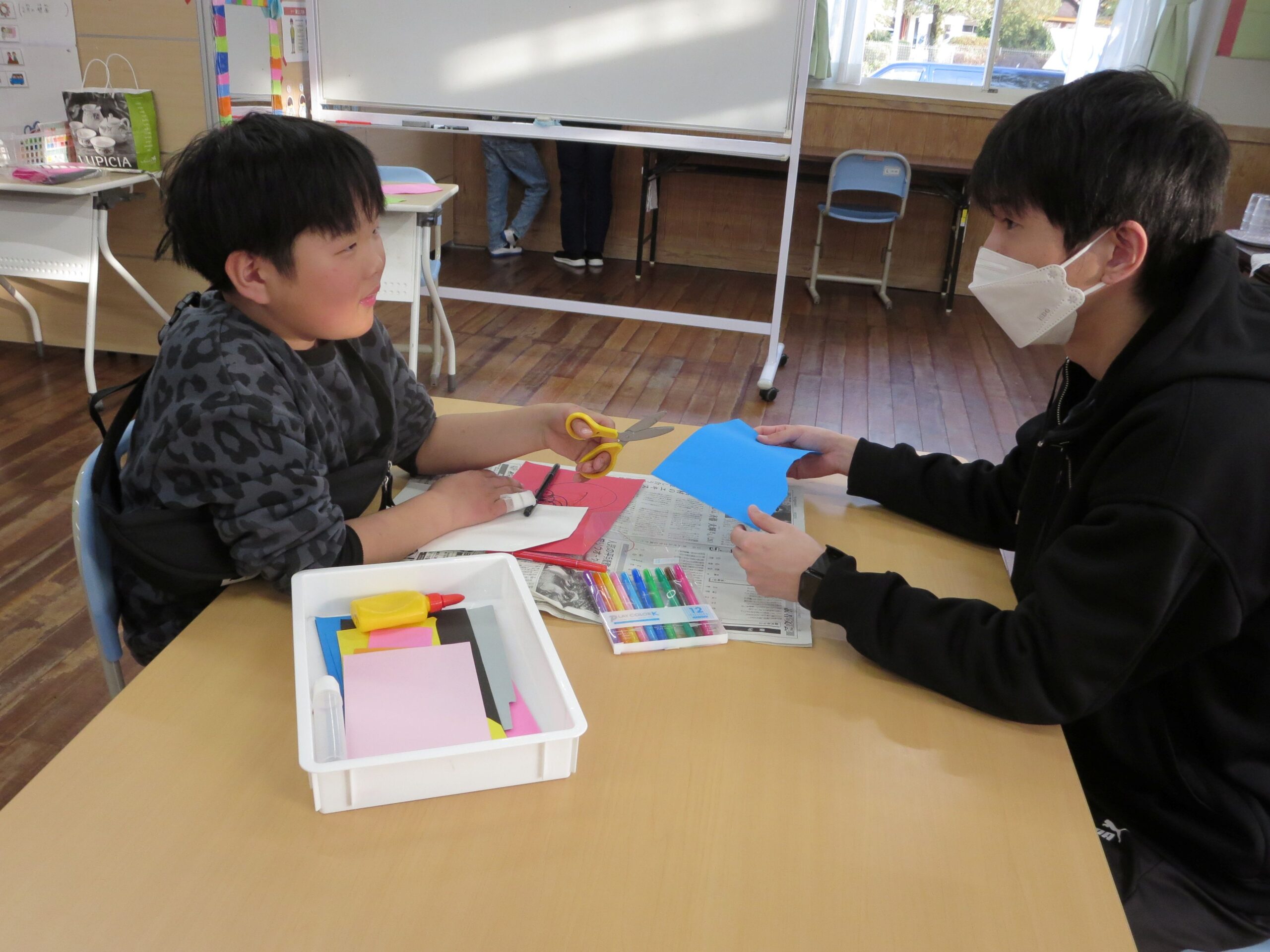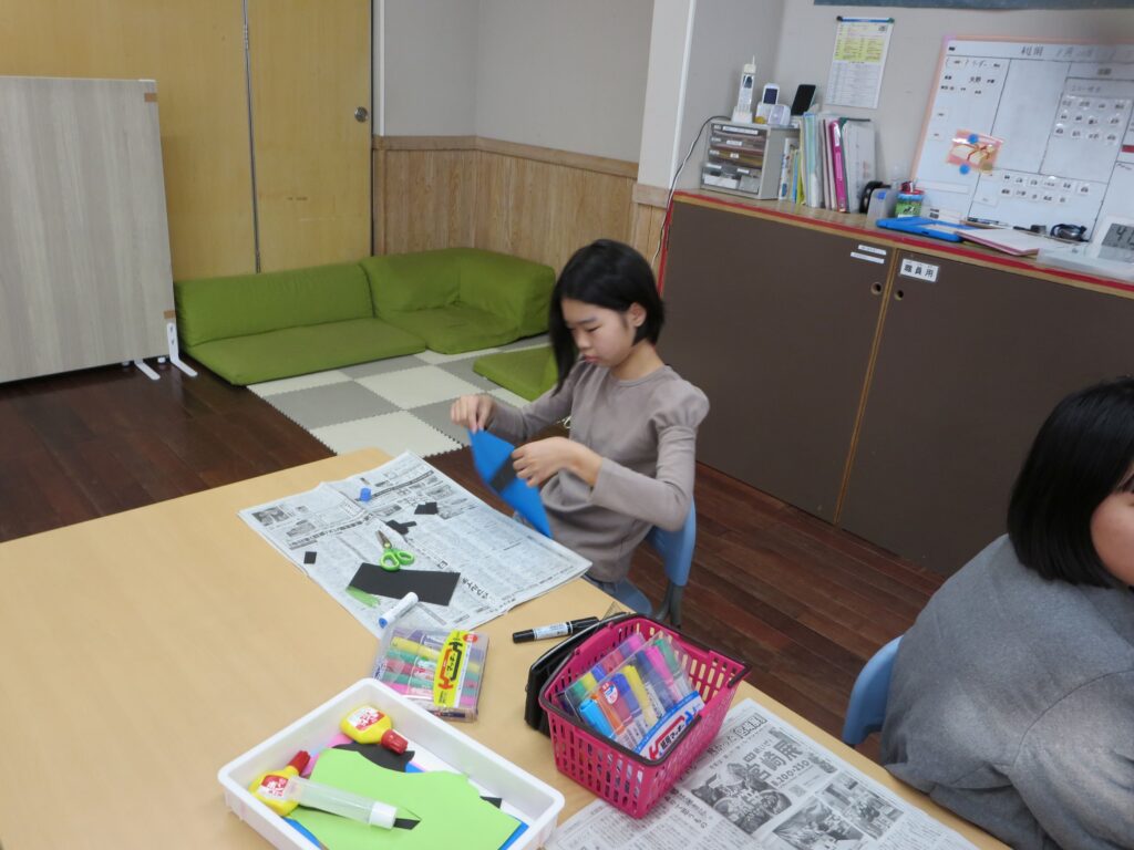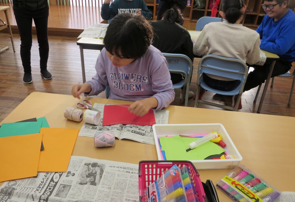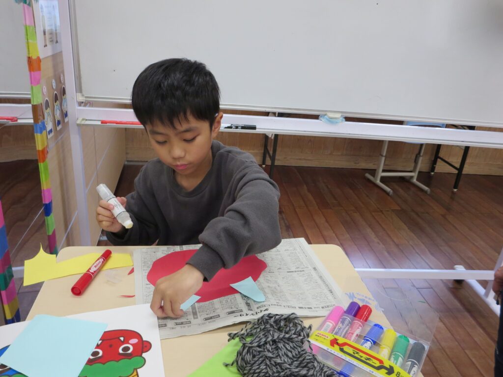 毛糸、色画用紙、ペンを使い思い思いの鬼のお面を製作して準備万端!
