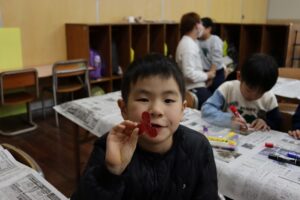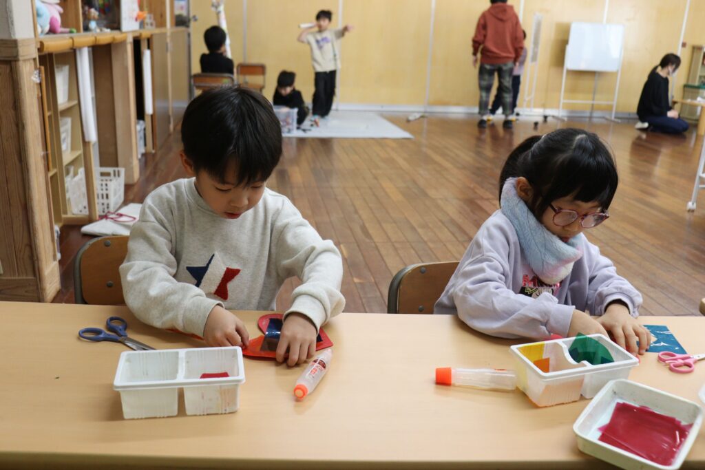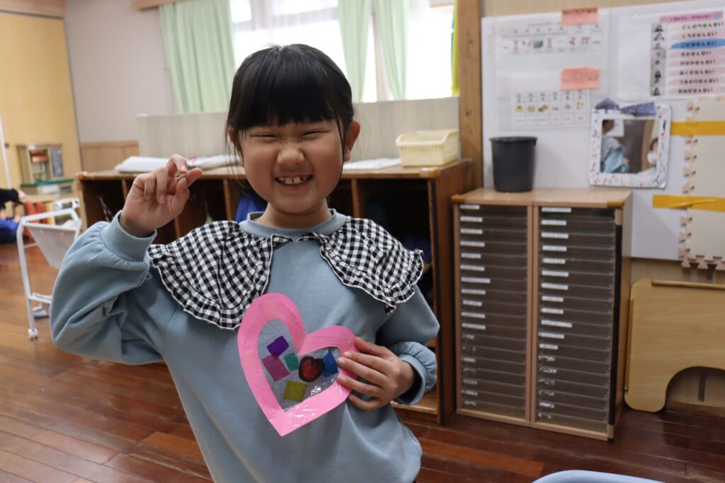 2月7日 午前中の活動で、バレンタイン製作、ハートのサンキャッチャーを作りました。カラーセロハンをハサミで切るところが、少し難しいようでしたが、色を重ねたり、いろんな色を貼ったりして、思い思いのサンキャッチャーができました。玄関に飾っていますので、見てくださいね。