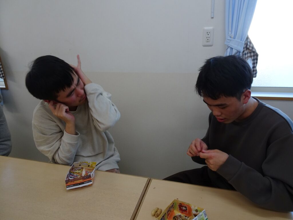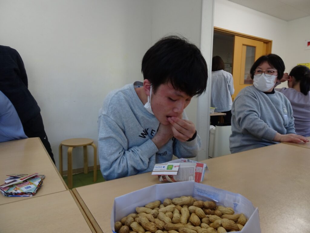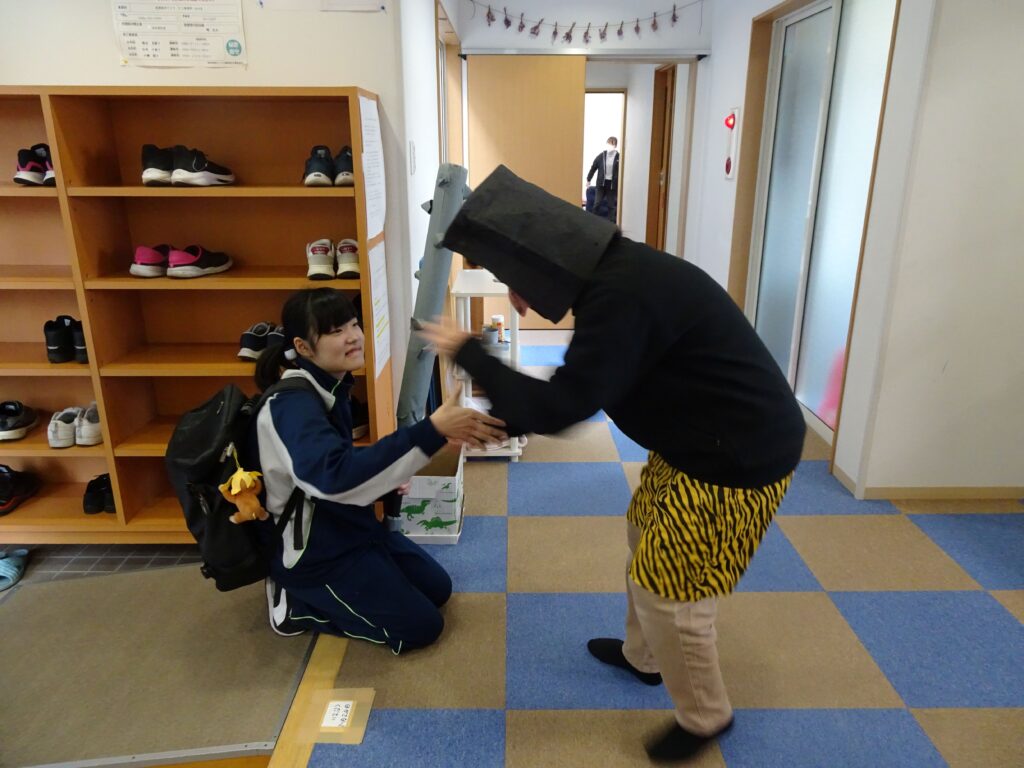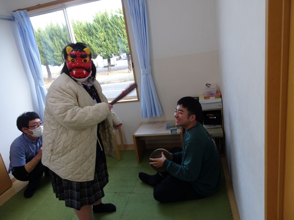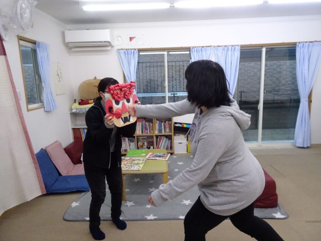 鬼退治 2026 2/12 なかま ちょこっとだけ鬼登場のつもりが・・・子どもたちが鬼を買って出てくれ、近づいてくる鬼ににっこにこして金棒やピコピコハンマーで優しく退治したり・・・大盛り上がりしました。手加減することをよくわきまえている子どもの鬼たちでした。 なかま