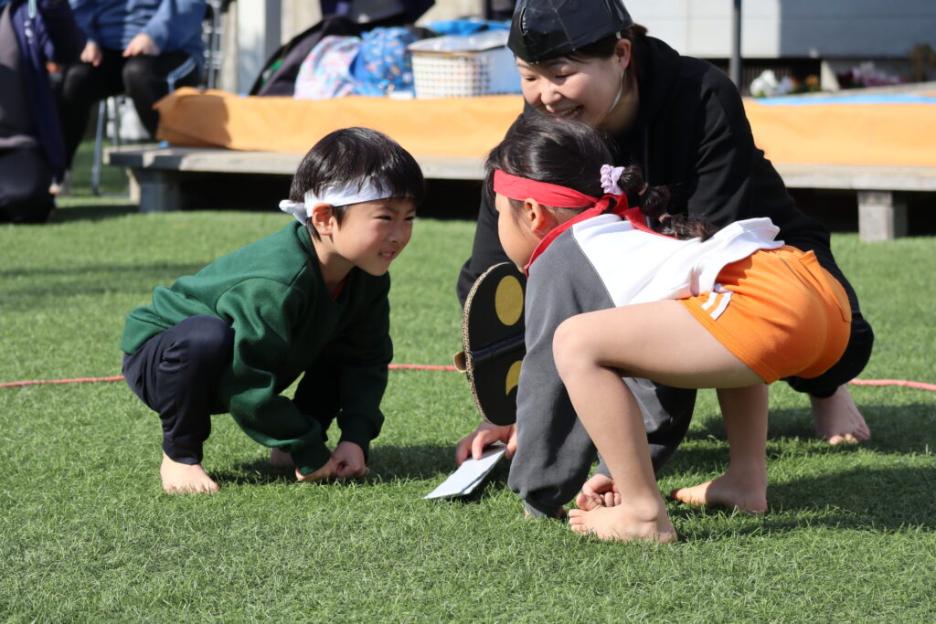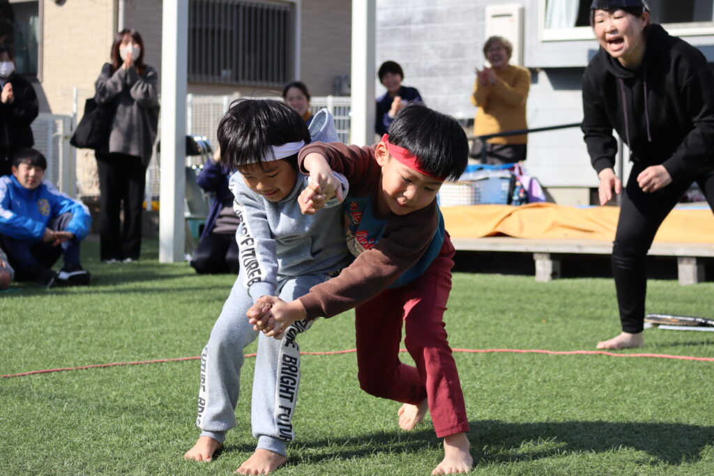 まんまる部門では、家族が応援する中“おすもう大会”がありました。子どもたちは、柔軟体操や四股ふみなど練習を積み重ねて本番を迎えました。