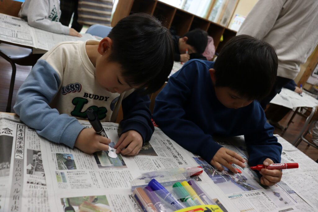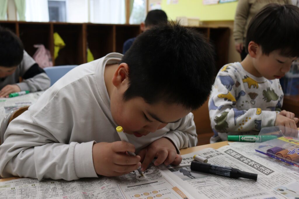 今回の活動では、手作りハンドスピナーを作りました。子ども達はスピナー型に切られた厚紙に好きな模様を描いていました。本体が出来上がるとストローで作った軸を職員と一緒にはめ込み、段ボールで作った歯止めで止めて完成させました。