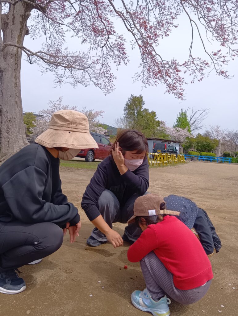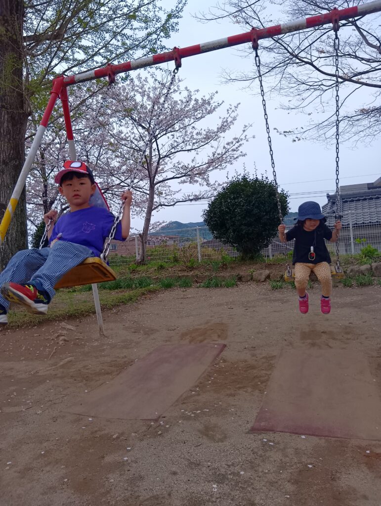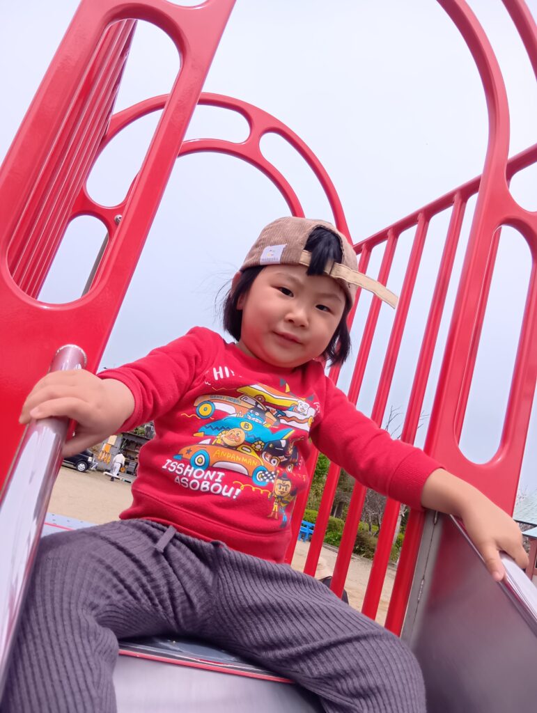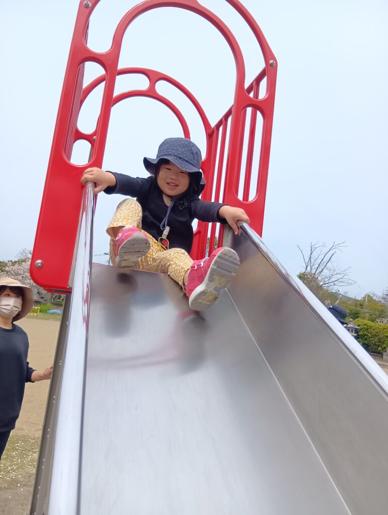 この日は久しぶりの良い天気で、桜も満開!お母さんと手を繋いで野地公園に行ってきました。