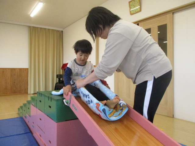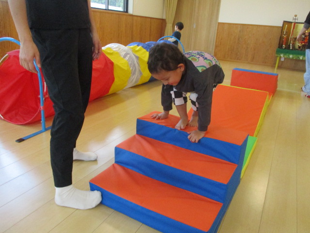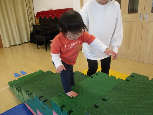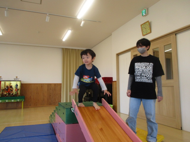 運動あそび 2026 4/16 あはは 室内での運動あそびの様子をお届けします。 ブロックの上のような不安定な足元の所をお母さんと手を繋いで歩いたり、 巧技台の階段を昇って滑り台を滑ったりしました。 足元が不安定な場所は慎重に進み、ゴールまで到着できると笑顔になっていました。 お母さんとたくさん身体を動かすのがとても楽しかった子どもたちでした。 あはは